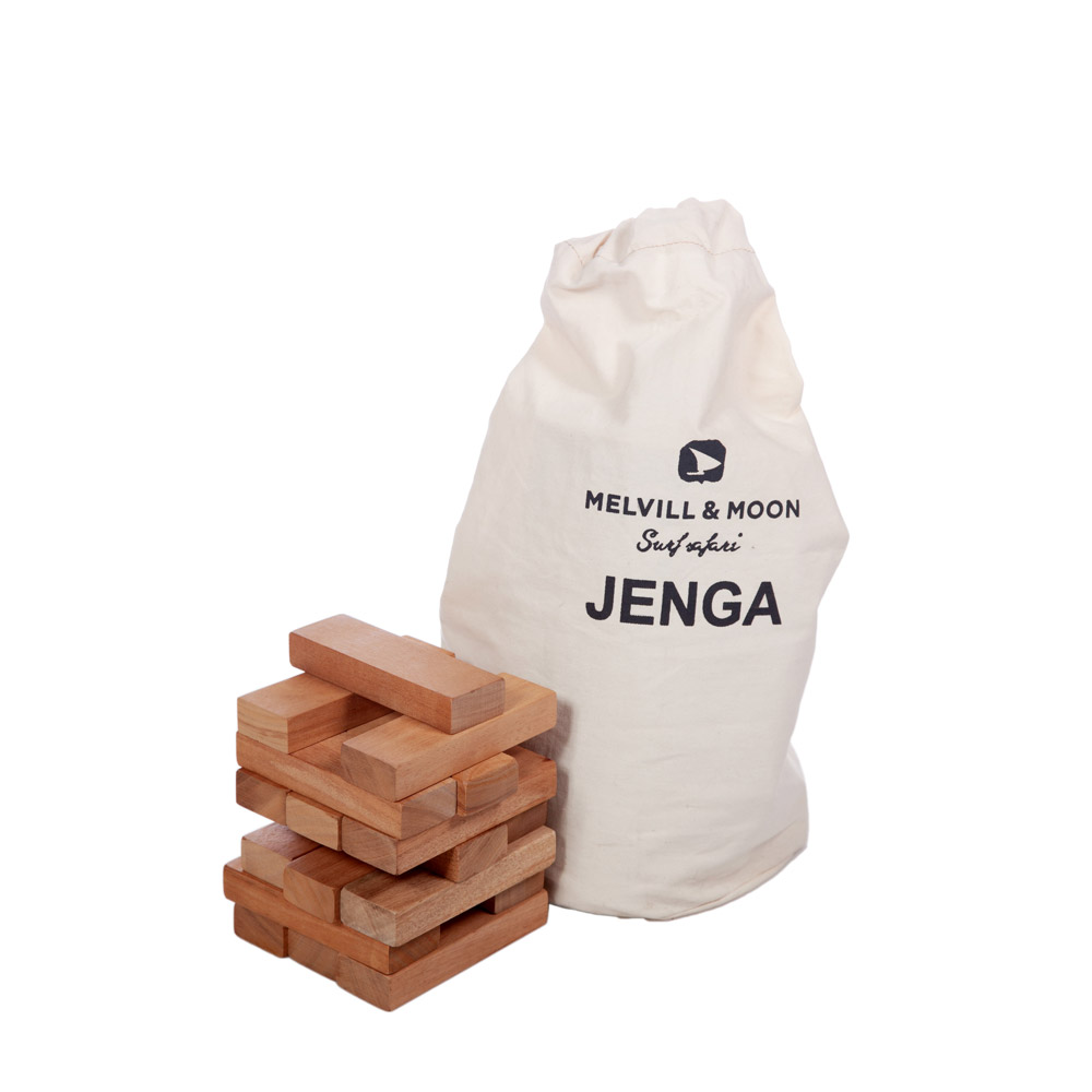 51-piece Jenga set made up of large wooden blocks, supplied in a canvas carry bag.