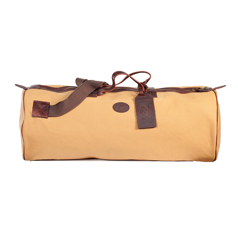 The duffels are a real pleasure on Safari. Unlike hard shell bags wich dont yield, these Duffels make packing easier. Although they are handsome enough to look at ease in the boot of a vintage Rolls the idea is not to feel precious about them; Strap them to the roofrack. Squash them into the hold of a bush plane. Both the medium and short duffel feature a strong zip down the long side for easy access. They are lined on the interior, have a zip pocket for valuables and the heavy webbing strap is conveniently offset for more comfort when carrying it.