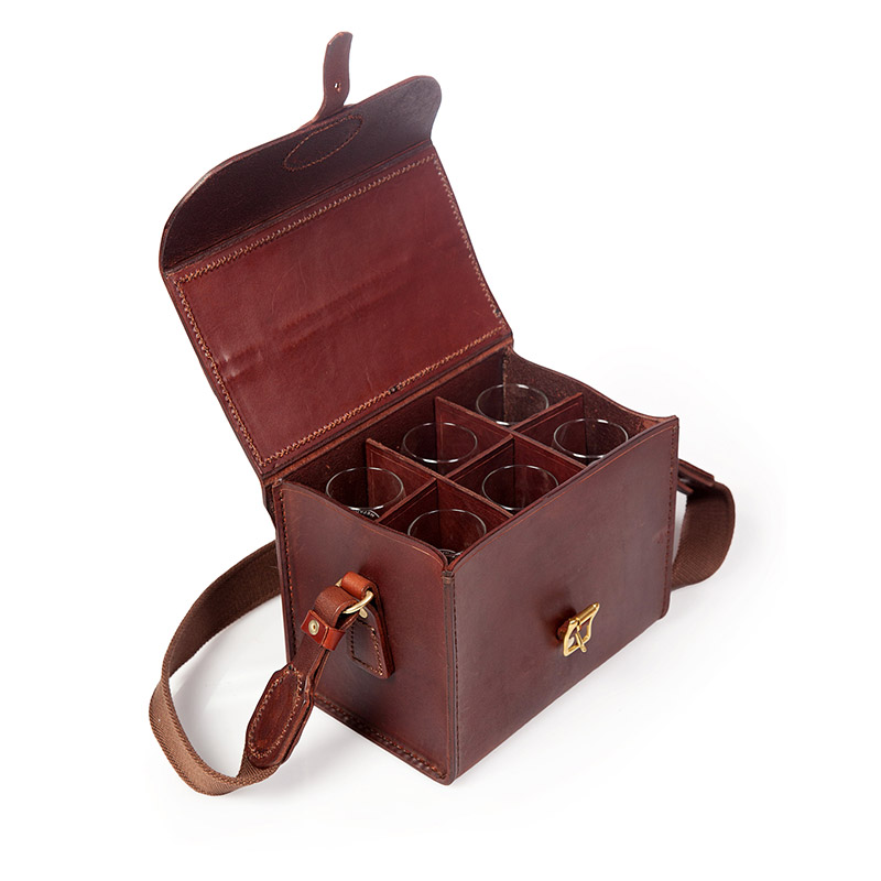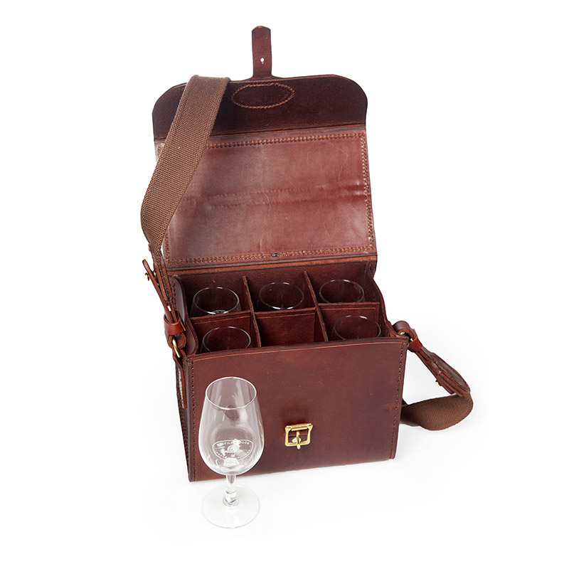 A hand stitched leather carry box made from vegetable tanned leather and comes with a shoulder and hand carry strap. It can hold 6 glasses for your picnic or sundowners. Supplied with 6 wine taster glasses – compact and highly useful on the beach or on safari.